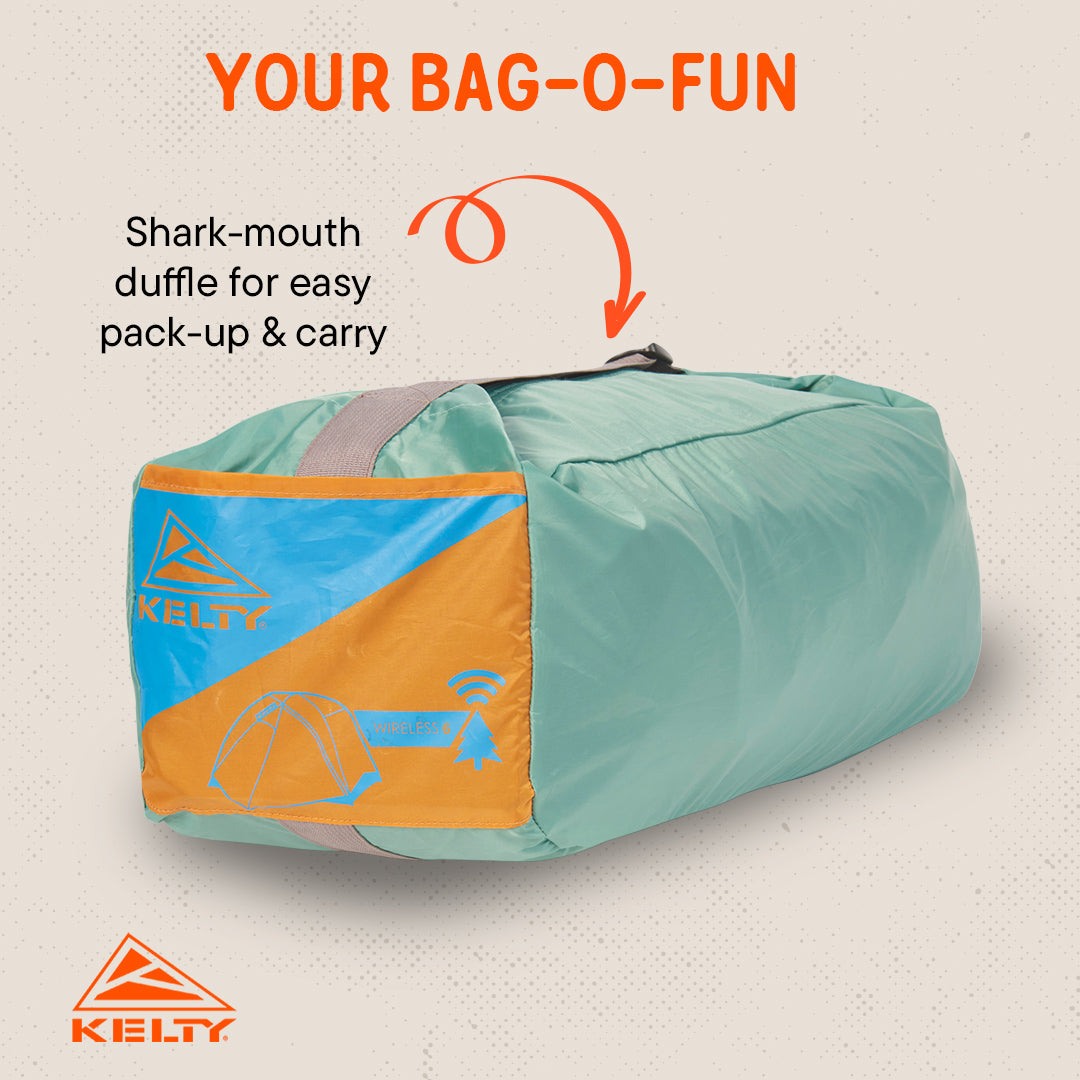 Sometimes you have to disconnect to connect. Get ready to leave it all behind and soak up the au naturel feels of the outdoors with the new Wireless 6 tent. It features Kelty Quick Corners for lightnin'-fast setup, plus our new Shark Mouth duffel for effortless pack-up. Two-door, two-vestibule construction makes your new digs ultra-livable...while our new EZ-Zip vestibule makes getting in and out…well…easy.