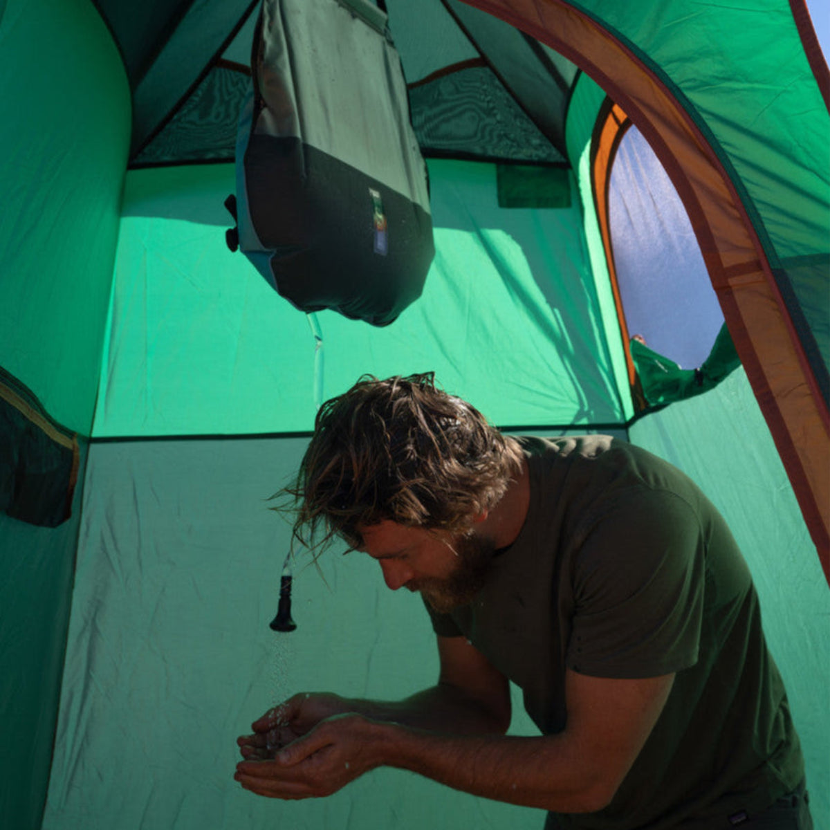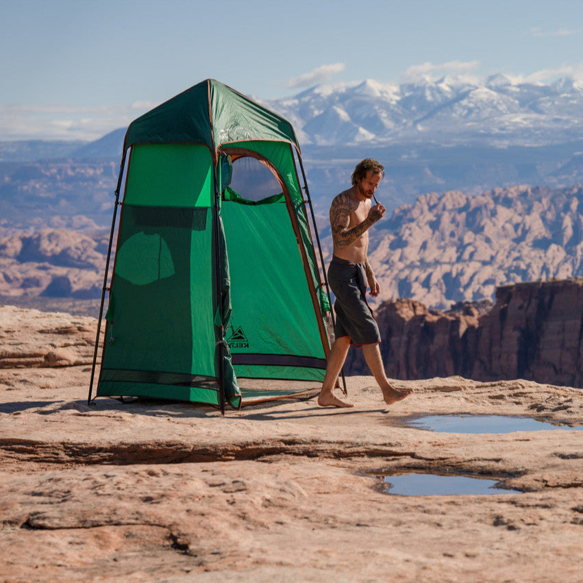 Close up of Kelty Discovery H2Go Shelter, showing towel hanging on outside of shelter